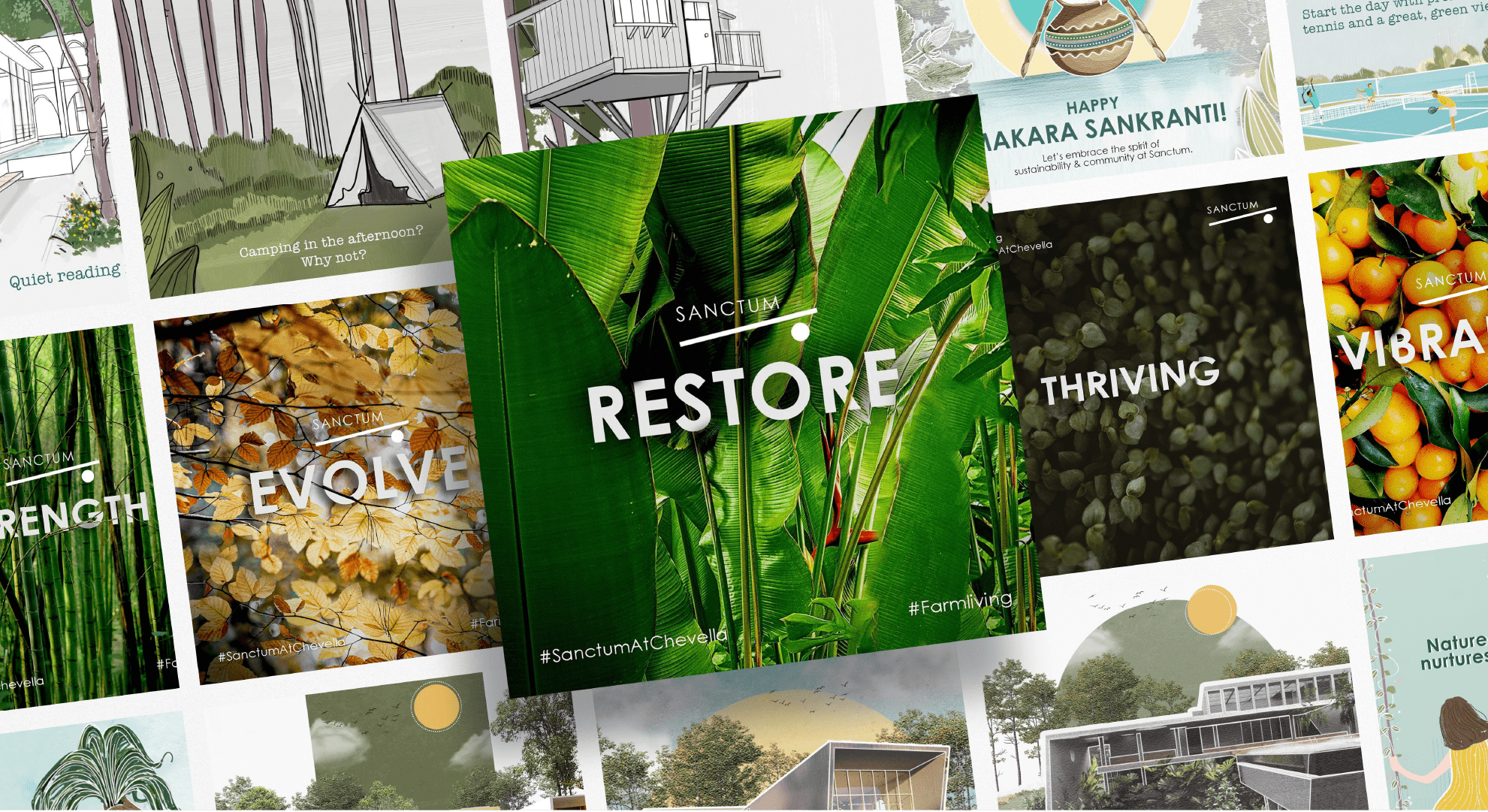 As the designer behind Sanctum's branding, my process began by immersing myself in the essence of the brand: sustainable living and a close bond with nature. I developed a design language that captured the tranquility and eco-friendly ethos of the community. The color palette embraced earthy tones, invoking a sense of grounding and harmony. I also created a range of social media posts that showcased the beauty of Sanctum, highlighting its sustainable practices and the serene lifestyle it offers.To ensure a cohesive brand identity, I collaborated closely with the Sanctum team, understanding their vision and incorporating their feedback throughout the design process. Iterative refinements allowed us to strike the perfect balance between aesthetics and conveying the core values of the brand.